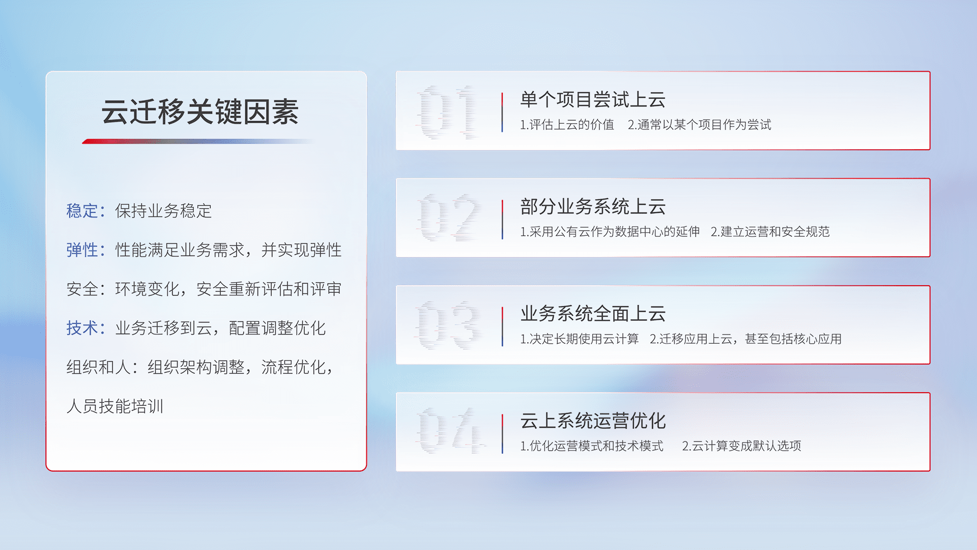 结合实际业务,,,从规划设计、、、云平台选型、、、、云原生改造、、、数据迁移、、集成交付,,迁移全过程为客户识别最佳上云路径,,,,做好风险识别管理,,,设计网络架构、、、身份权限、、、、安全审计合规、、、操作审计、、、、日志审计、、、监控告警策略、、、、多站点容灾设计等,,,,对云上基础设施进行整体规划,,提升IT治理水平,,,,以满足弹性、、、、高可用、、、高性能的需求。。