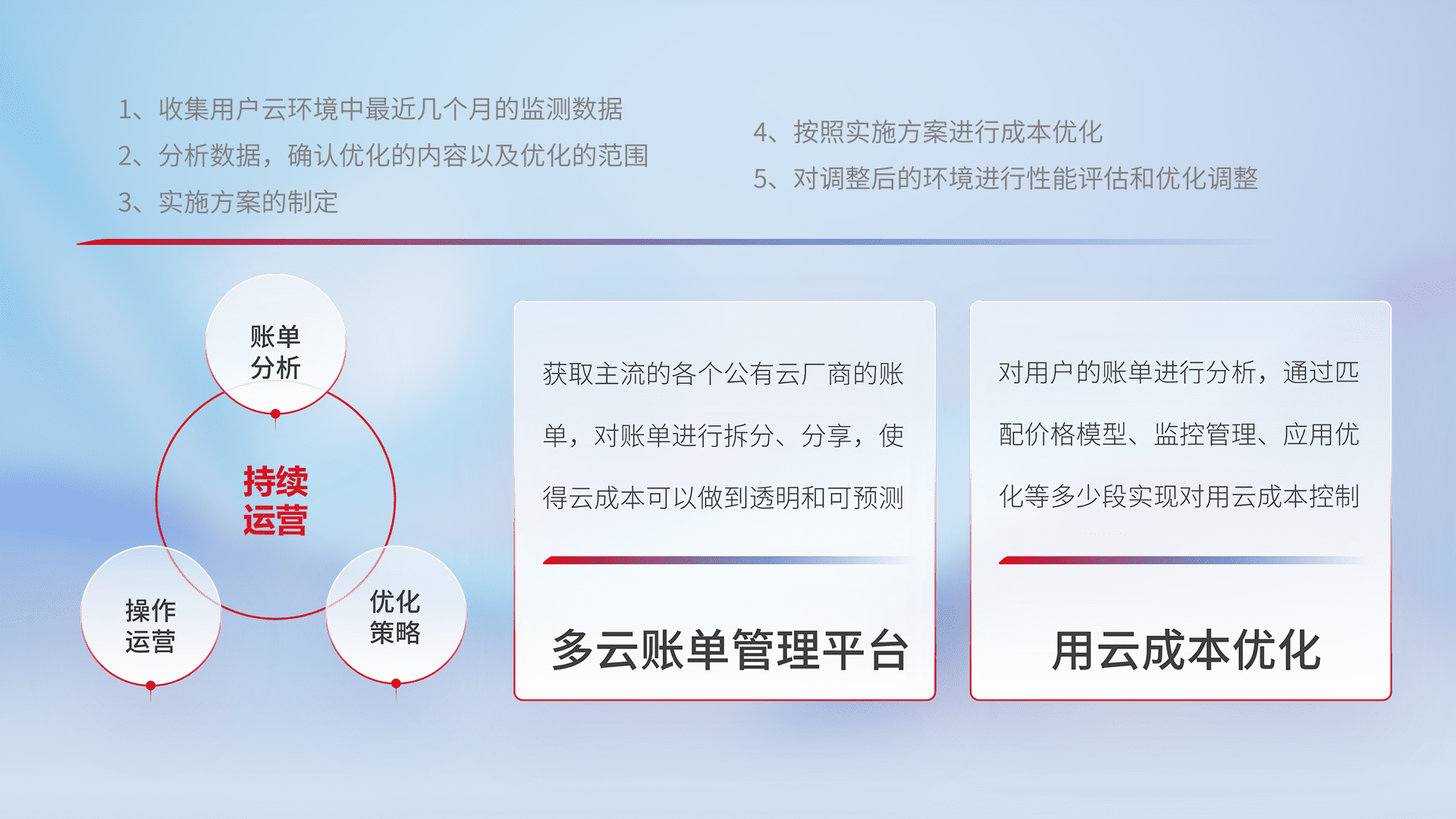 通过灵活运用多种自动化迁移工具,,,帮助企业用户实现业务和数据高效 、、、稳定的上云迁移和云上迁移,,采用自研多云纳管平台,,以中立管理模式,,,解决多组织、、多云、、多运维厂商的复杂关系的管理,,,保证多云平台资源配置的一致性,,,,实时掌控云资源运行数据,,,运用智能化工具分析云资源多云平台的管理服务,,,透明化管理成本支出,,,,用云成本可预测、、、、用云费用可优化、、云资源配额有据可依。。。