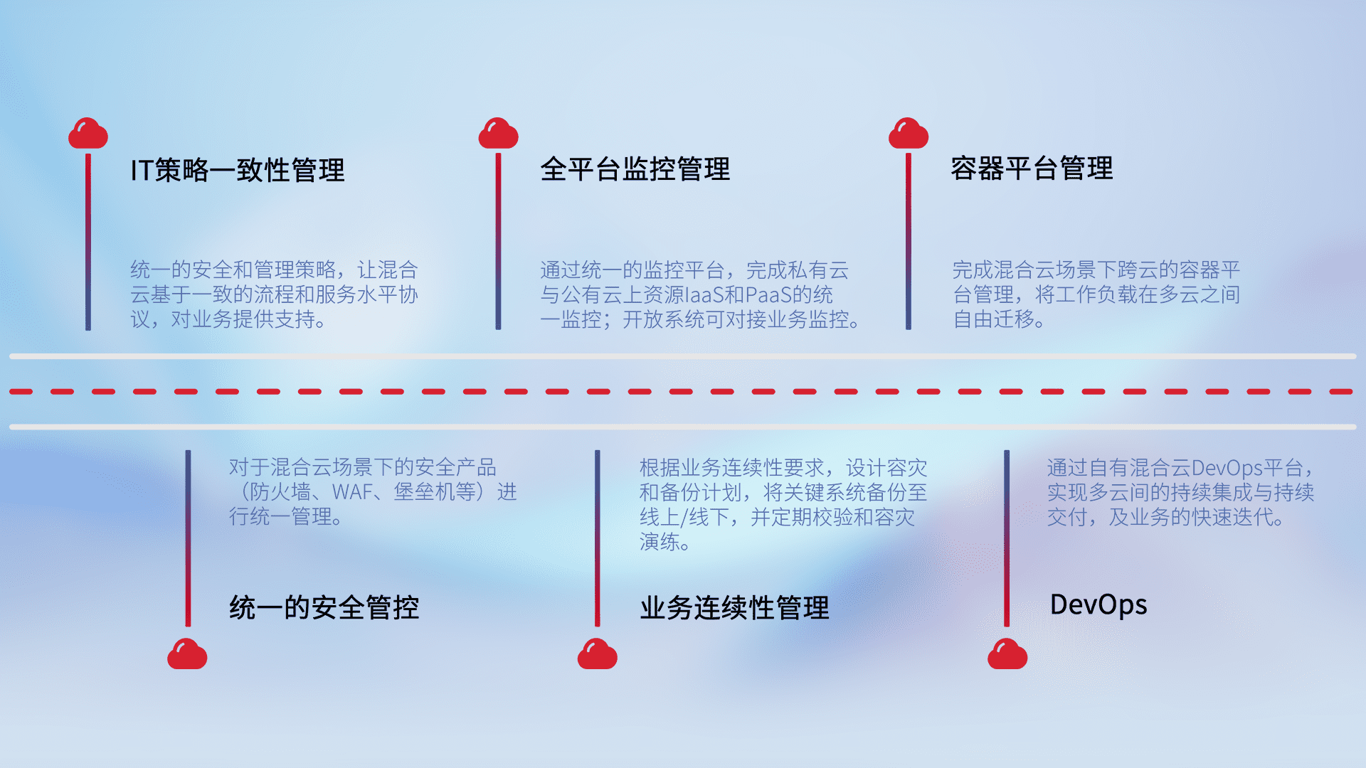 通过多云纳管,,以统一的资源数据模型把客户的云资源进行抽象和封装,,,进而实现对多云资源的统一操作,,,保障云资源管理的可靠性、、、稳定性与可用性。。。量身定制化运维内容,,配置、、、开发运维、、、、补丁管理、、备份、、监控、、、、认证和访问管理、、、、审计和日常巡检等,,,保障在用云过程中的可靠度,,稳定度以及高可用率。。